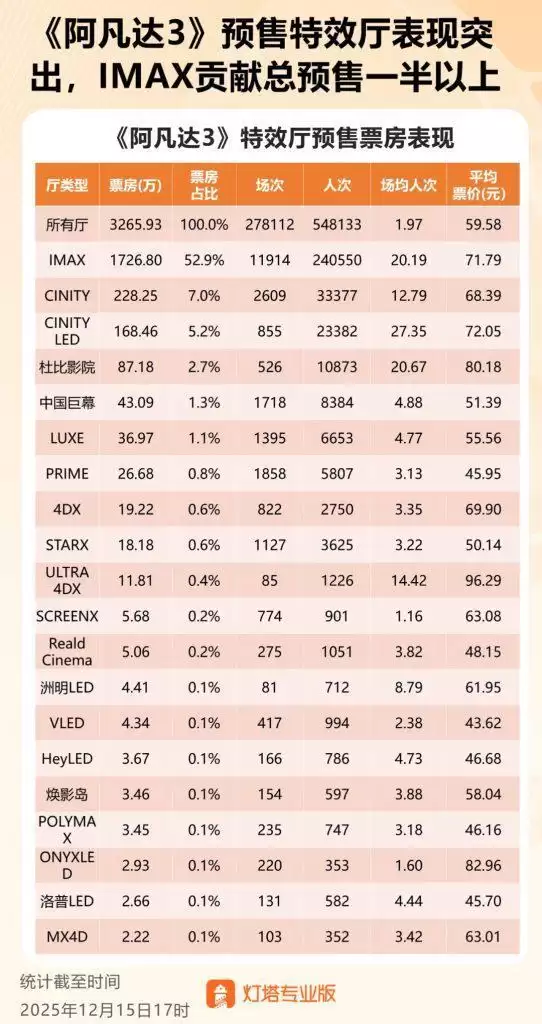 根据灯塔研究院在 12 月 15 日公布的数据,《阿凡达 3》预售票房 3265.93 万元,其中 IMAX 影厅票房占比 52.9%,CINITY LED 和杜比影院也将近 10%,特效厅表现突出。