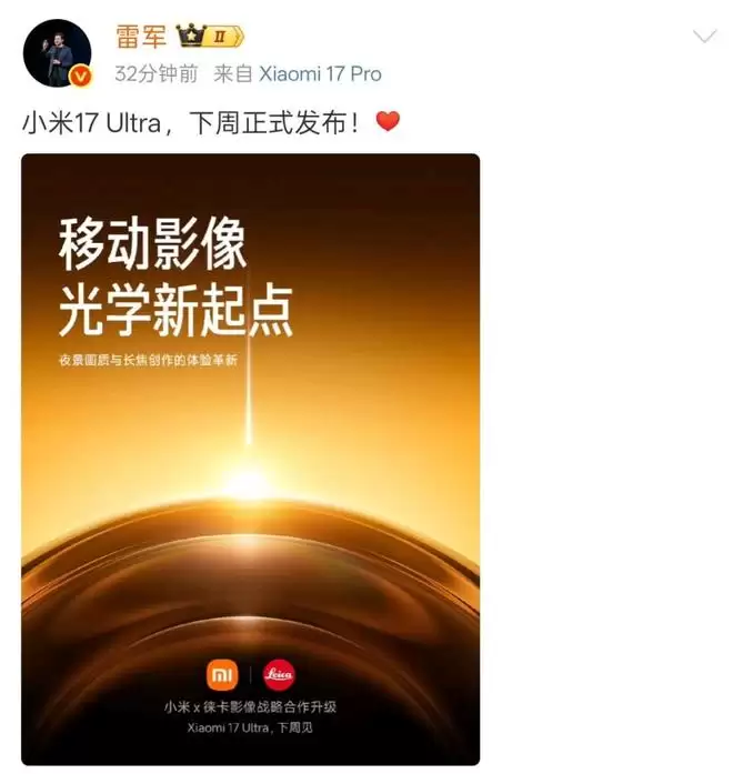 而且,小米集团董事长雷军亲自宣布,小米17 Ultra将于下周正式发布,紧随其后,小米集团总裁卢伟冰披露了与徕卡达成全球影像战略合作升级的重磅消息。
