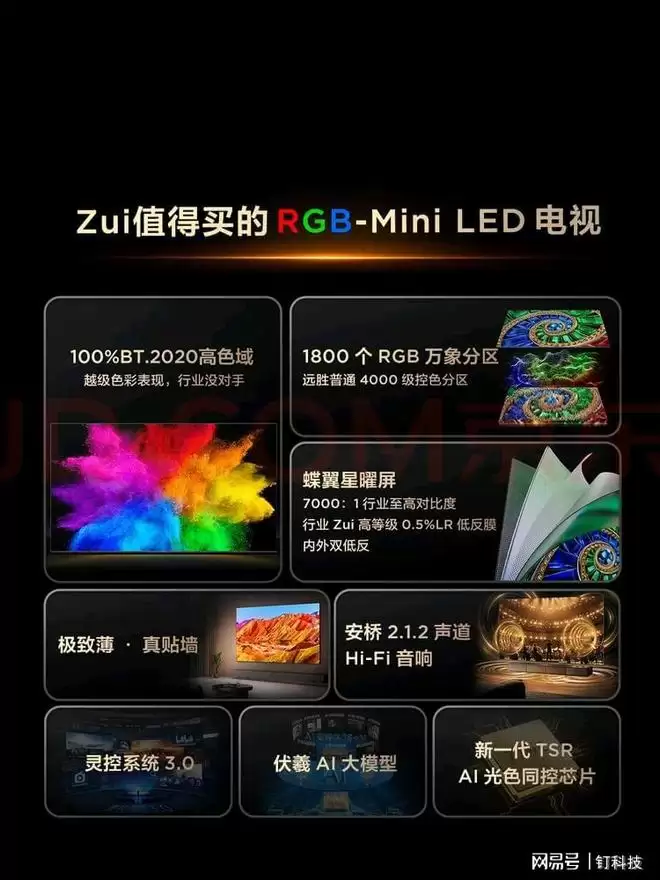 电视显示技术的发展史,本质上是一场对“光”与“色”的极致追求史。RGB-Mini LED采用红、绿、蓝三色LED芯片作为背光光源,理论上能够覆盖更广的色域,实现更纯净、精准的色彩还原,被视为Mini LED技术的“完全体”。