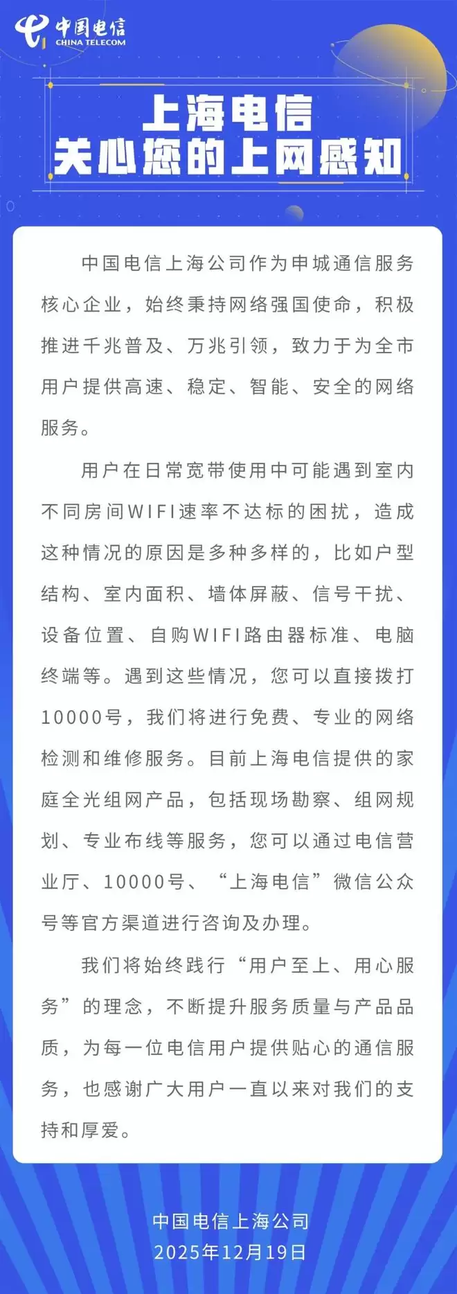12月19日晚,上海电信通过其最新的客服渠道“中国电信上海客服”发布公告,标题为“上海电信关心您的上网感知”。公告中强调,公司作为申城通信服务的核心企业,始终肩负网络强国的使命,积极推动千兆网络普及与万兆技术引领,致力于为全市用户提供高速、稳定、智能且安全的网络服务。