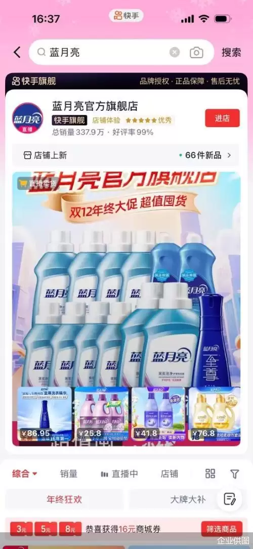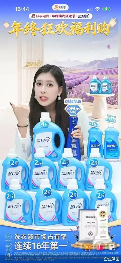 作为专业家庭清洁品牌,蓝月亮自2024年入驻快手以来,聚焦新线城市用户,尤其是北方区域,借助平台“熟人社区”氛围来深耕信任。2025年快手年终购物狂欢节,面对“内容+货架”融合的新趋势,蓝月亮迅速调整策略,成为“商品卡川流计划”的受益商家。