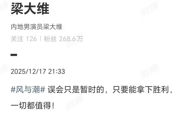 12月17日,也就是《风与潮》港币汇率大战收官时,对于乔仁宇被妹妹的误会,梁大维发博说:误会只是暂时的,只要能拿下胜利,一切都值得!