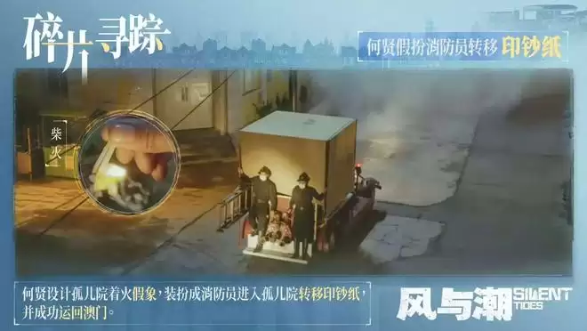 当天夜里,何贤他们在孤儿院后院放火,然后假扮成消防队,潜入孤儿院,运走了印钞纸。