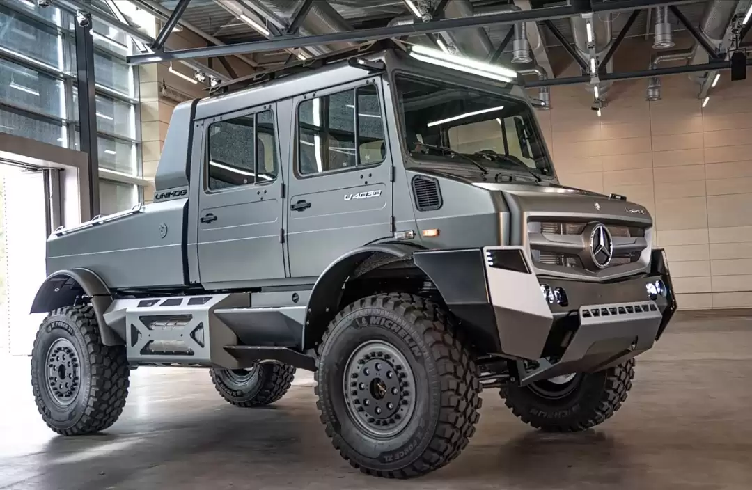 奔驰乌尼莫克U4030为纪念品牌80周年打造,基于U4023平台强化越野性能。哑光灰车漆搭配车顶探照灯与电子后视镜,货厢式四座布局突显功能性。动力搭载300马力7.7T六缸柴油发动机,匹配全时四驱系统与三把差速锁,足以应对极端路况挑战。