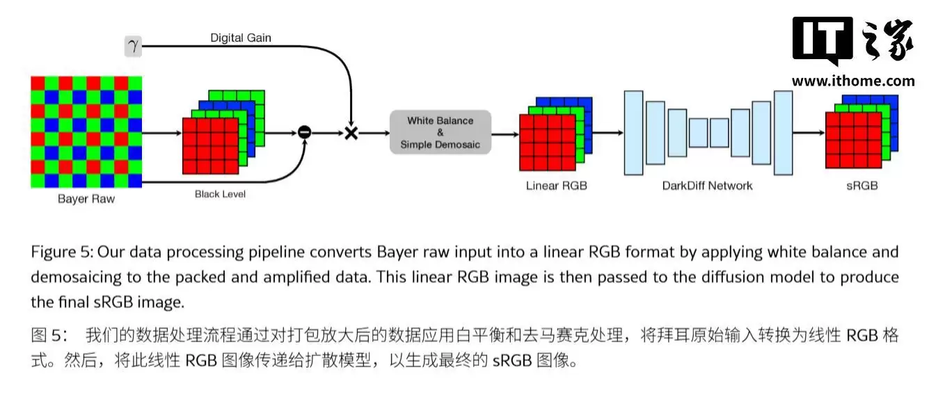 ISP负责完成白平衡和去马赛克等基础处理后,会生成线性RGB图像,随后DarkDiff便立即接手,执行降噪与细节生成任务。这种深度集成的方式,让AI能够理解照片在黑暗区域应有的纹理细节,而非简单地模糊像素。