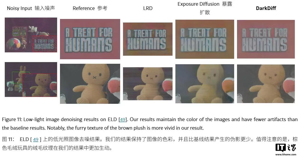 为验证效果,研究团队使用索尼A7SII相机在极暗环境下拍摄了测试样本,曝光时间短至0.033秒。他们将经DarkDiff处理后的图像,与使用三脚架进行长曝光拍摄的参考图进行对比。结果显示,DarkDiff在色彩还原和细节清晰度上均优于现有的Raw图像增强模型。
