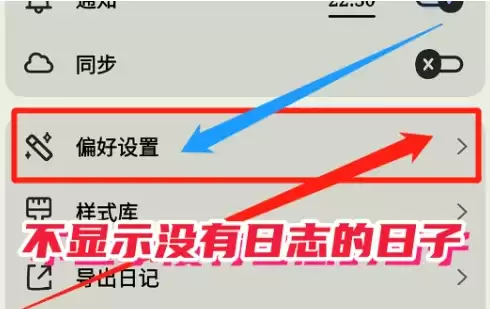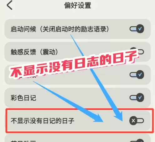 第三步:开启隐藏开关。在偏好设置界面里,找到【不显示没有日记的日志】这一项,点击旁边的开关按钮将其打开即可完成设置。