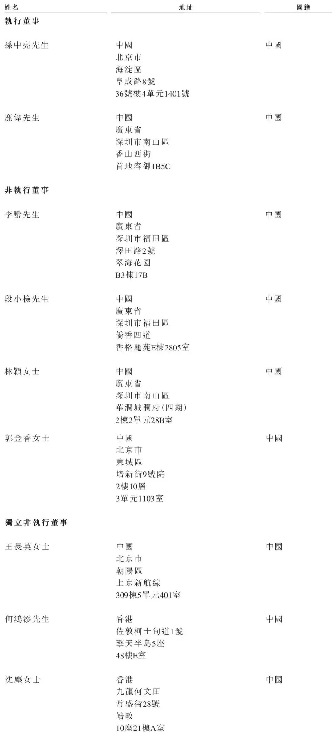 华大北斗的执行董事分别为孙中亮、鹿伟,非执行董事分别为李臻、段小检、林颖女士、郭金香女士;独立非执行董事分别为王长英女士、何鸿添、沈尘女士。