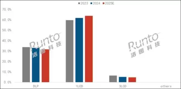 技术路线方面,长期主导市场的1LCD产品,其增长势头预计在2025年终止,份额为63.7%。DLP技术路线份额则进一步收缩至31.6%,其上游厂商德州仪器正通过推出低成本芯片和加快4K布局来应对市场变化。
