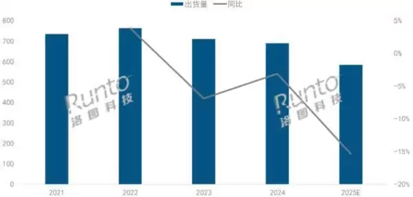 CNMO科技消息,12月10日,市场调研机构洛图科技(RUNTO)发布的最新报告显示,自2024年“宅经济”拉动市场增长后,中国投影机市场已步入连续三年的回调阶段。报告预测,2025年整体市场出货量将下滑至583.4万台,同比下降15.4%。这意味着市场在2024年触及764万台的峰值后持续收缩,并首次跌破600万台区间。