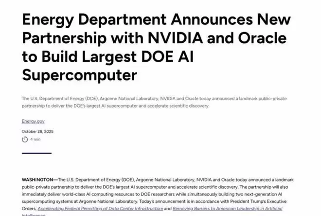 去年十月,美国能源部发布了一则重要公告,将与英伟达、甲骨文两家科技巨头携手,共同为美国打造性能最强大的AI超级计算系统。这个被寄予厚望的系统,有望显著推动从气候科学、国家安防到诸多前沿领域的研究创新进程。