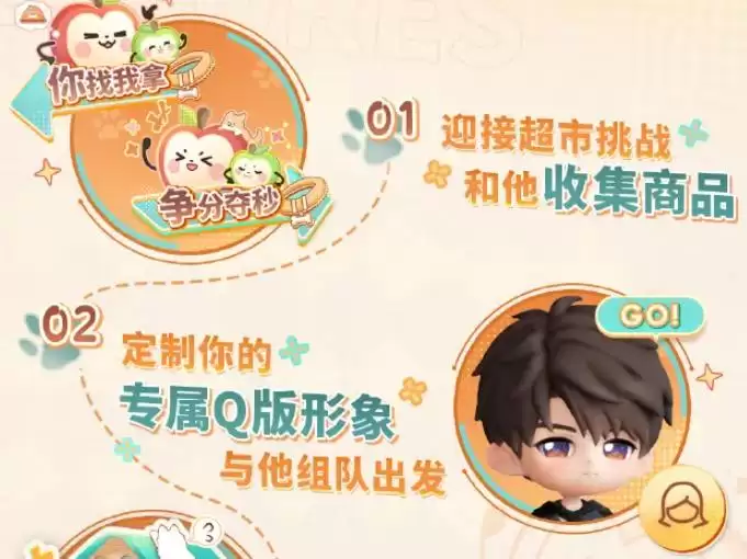活动开始后,先要和夏以昼一起整理货架,接着完成超市挑战,收集指定商品。之后是定制专属Q版形象,并与夏以昼组队。接下来就能体验活动专属剧情,携手挑战“宠物救助公益赛事”。