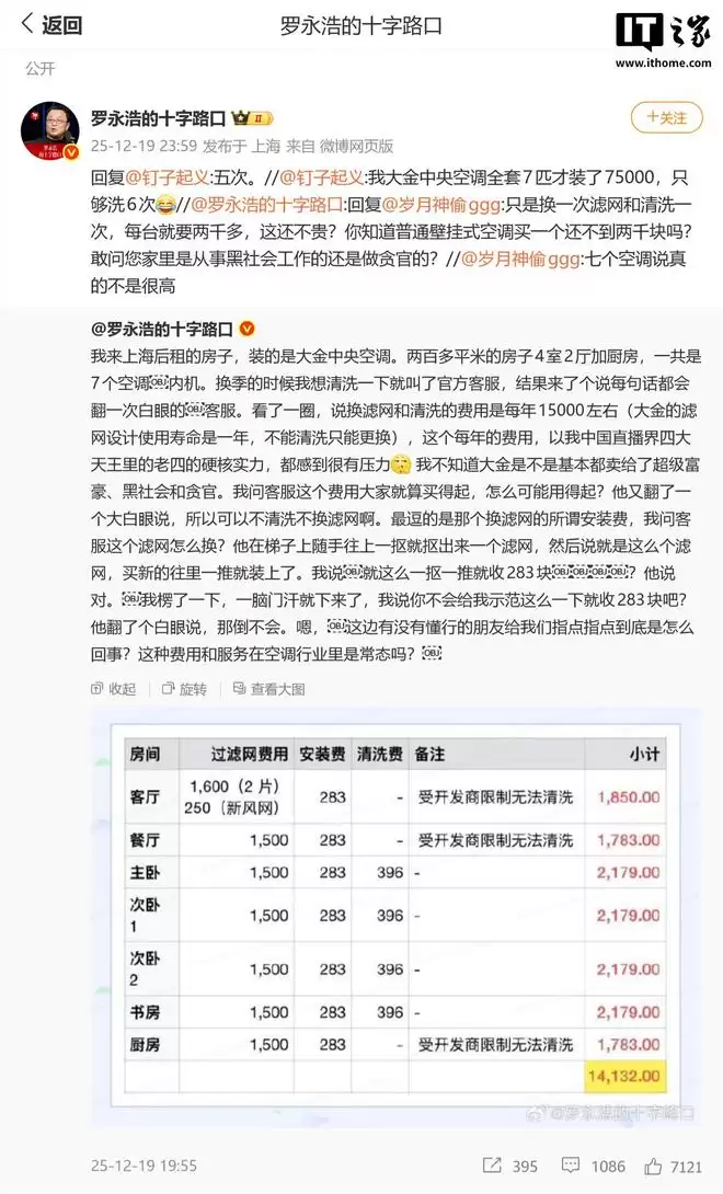 IT之家 12 月 20 日消息,@罗永浩的十字路口 昨日(12 月 19 日)发布微博,公开质疑大金中央空调的售后维护价格体系及服务态度。根据其晒出的报价单,其 7 台大金空调内机每年的维护成本约