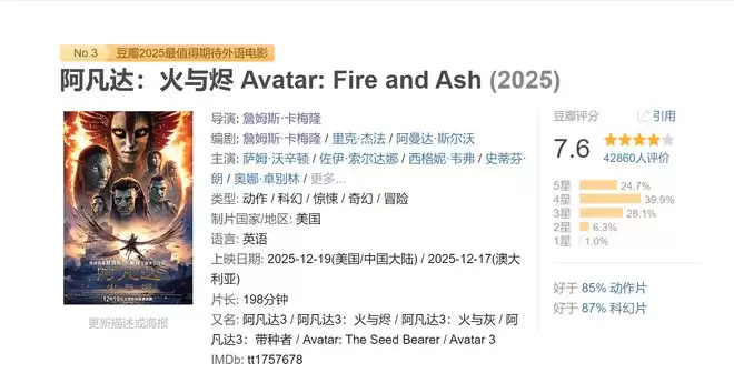 在卡神《阿凡达3》“技术优势”与“故事短板”严重失衡的情况下,国内外影迷的剧情吐槽倒是出奇的一致,这点从烂番茄新鲜度68%、Metacritic评分61分、IMDb开分7.3分中都能窥探一二,国外主流平台所打的分值都是系列中最低。