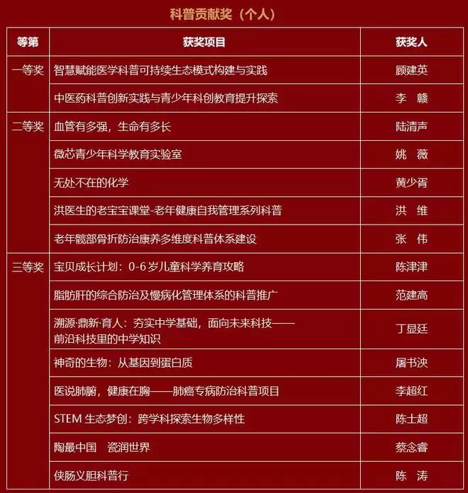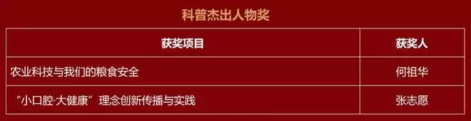 中国科学院院士、中国科学院分子植物科学卓越创新中心研究员何祖华,中国工程院院士、国家口腔医学中心名誉主任张志愿教授,因其在农业科技、口腔健康科普方面的卓越贡献,获评“科普杰出人物奖”。
