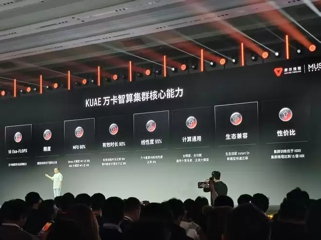 根据现场信息,“夸娥”万卡智算集群浮点运算能力达到10Exa-Flops,训练算力利用率(MFU)在Dense大模型上达60%,MOE大模型上达40%,有效训练时间占比超过90%,训练线性扩展效率达95%,与国际主流生态高度兼容,并在多项指标上具备能效优势。