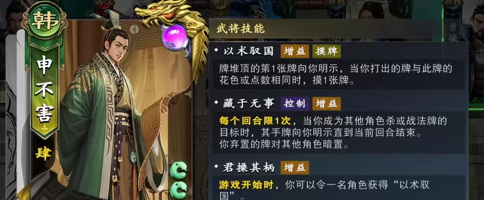 首先来看申不害的技能特点。他的定位是一名干扰型武将,一技能“君操其柄”具有类似绑定效果,开局后可以选择一名队友,使双方同时获得“以术驭国”的增益。只要自己或队友没有阵亡,该效果就会一直存在,这样就能与鲁肃形成稳定的联动。