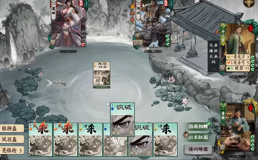申不害与鲁肃的组合核心在于不断干扰对手的行动。开局由申不害使用技能窥探对方手牌,并将情报传递给鲁肃,由鲁肃判断该目标是否构成威胁。一旦发现危险人物,立刻与场上最弱的玩家交换手牌,从而实现对战局的精准控制。