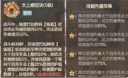 5、星级技·太上感应诀:缃清竹与"悟道"友军威仪提升10%,攻击伤害提升10%。单次受到伤害大于自身生命上限10%时,伤害降低60%,并获得等同于自身20%生命上限的护盾(持续5秒),极大提升团队生存能力。