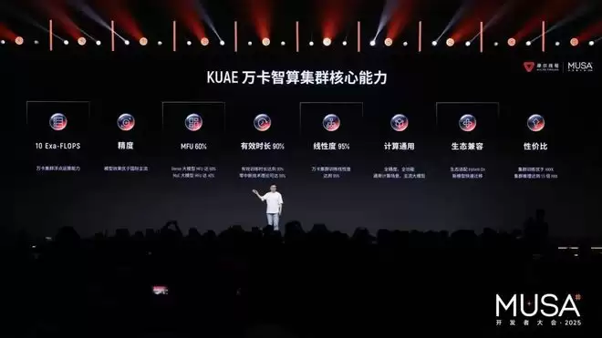 在国产算力的语境里,“万卡”从来不是把卡堆起来那么简单。更难的部分,往往是“能跑多久、跑多稳、跑多满”。因此,摩尔线程全新发布的“夸娥万卡”智算集群,成为了本次大会继“花港”架构之后的第二个亮点。