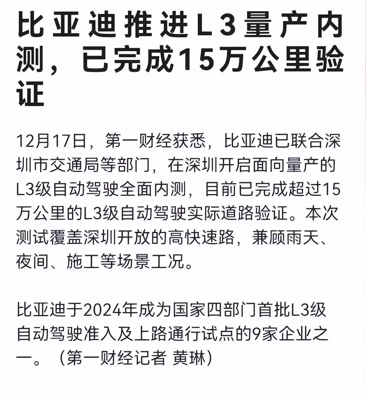 比亚迪在深开启L3自动驾驶实测:15万公里验证技术领先
