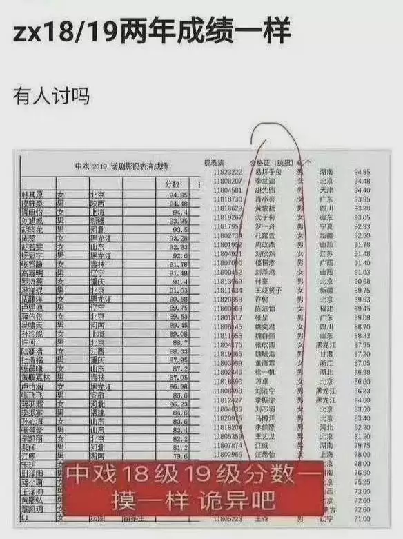 在一份网络流传的艺考成绩单中,有爆料指出2018年和2019年的艺考成绩完全一致。2018年,中戏吸引了易烊千玺、李兰迪、胡先煦、罗一舟等众多明星考生,他们的艺考排名似乎与知名度成正比。而2019年的明星考生,如蒋依依、孙珍妮等,知名度相对较低,排名也较为靠后。仔细对比两年的分数表,不仅前四名的分数完全相同,整个成绩单的分数都一模一样,连小数点后的数字都毫无二致,看上去仿佛只改动了姓名、籍贯和性别。