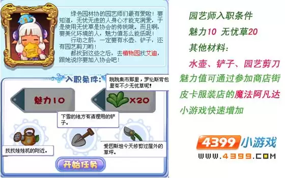 他会告诉你成为园丁所必备的条件:魅力值达到10点,准备20株无忧草,并集齐以下材料:锄头、水桶、园艺剪刀。