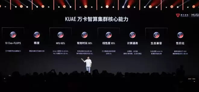 除了芯片外,本次MUSA开发者大会还正式发布了“夸娥万卡智算集群”。该集群具备全精度、全功能通用计算能力,在万卡规模下实现高效稳定的AI训练与推理。