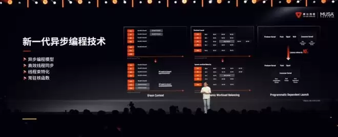 其次是异步编程与超大规模互联的支持。新一代异步编程模型,能够更好地优化任务调度与并行极致,而通过自研的MTLink高速互联技术,将支持十万卡以上规模的智算集群扩展。