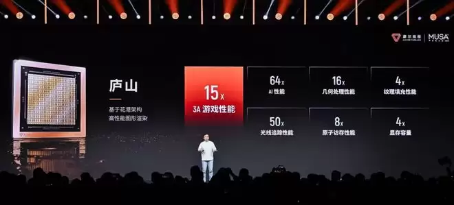 另外一枚用于高性能图形渲染的芯片“庐山”,其图像性能对比MMT S80,在集成了AI生成式渲染后,AI计算性能提升64倍,UtiTE统一渲染架构让几何处理性能提升16倍,全新的硬件光追引擎,让光线追踪性能提升50倍。