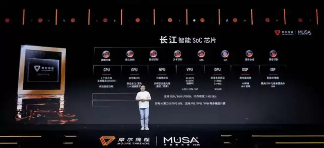比如在今天的开发者大会上,摩尔线程推出的“长江”SoC。这款芯片主要面向端侧,通过CPU+GPU+NPU的组合,最高可提供50 TOPS的异构AI算力。
