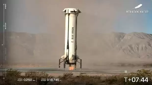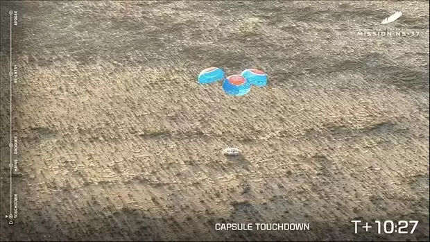“新谢泼德”号则依靠三具大型降落伞减速,最终在助推器及发射台附近扬起一阵尘土,平稳着陆。蓝色起源的地面支援人员迅速抵达飞船旁,协助乘员出舱。