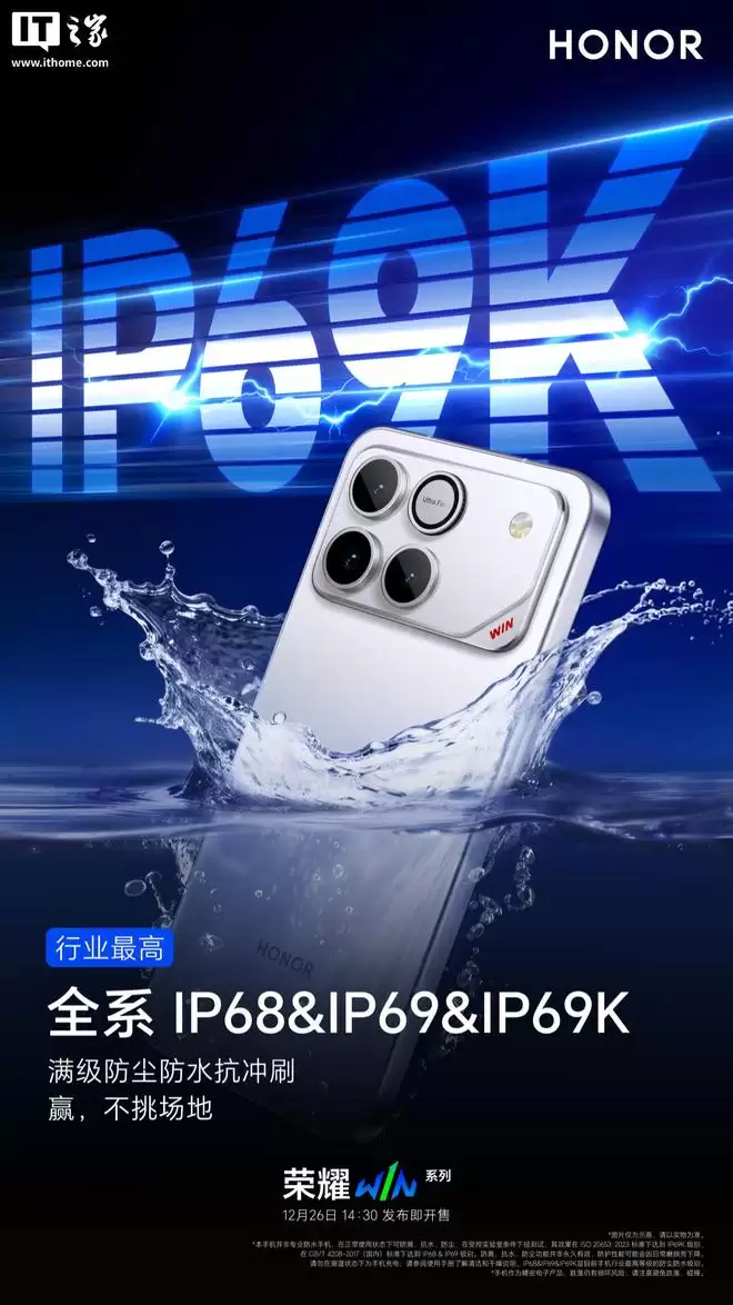 据介绍,荣耀WIN系列将全系支持IP68/IP69/IP69K级别的防尘防水认证。这意味着手机不仅能轻松应对汗水浸湿和雨水冲刷,甚至还能承受高温水流的冲洗,宛如做个“高温SPA”。强大的防护性能足以应对生活泼溅、户外极限运动等意外状况,官方更将其防水能力誉为“行业顶尖水准”。