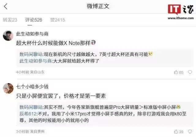 在相关讨论中,博主还回应了一些网友的疑问。针对用户能否做出像vivo X Note那样大屏的疑问,博主表示,现在新机的屏幕尺寸趋势越来越大,7英寸左右的超大杯机型未来确实有可能出现。而对于“小屏只是为了控制成本,价格才是关键”的观点,博主回应指出实际情况并非如此,今年各家品牌的新旗舰系列中,Pro大屏版本的销量普遍超过了标准版中屏和小屏版本。