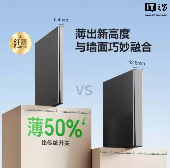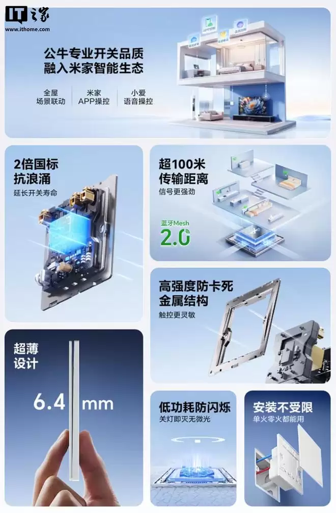 通过米家App,用户可以远程控制这款智能开关,同时它也支持小爱同学的语音指令。开关的厚度仅为6.4毫米,采用坚固的钢材固定架,并提供了五种不同的颜色可供选择。
