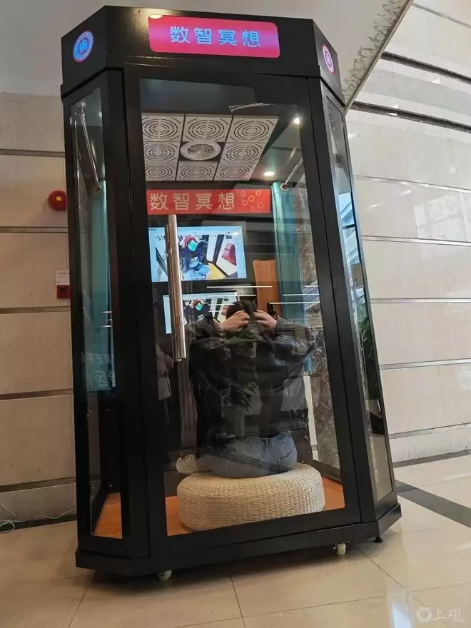 12月21日,正逢第二个“世界冥想日”,这是联合国去年12月决议设立的全球性纪念日。当天,华东师范大学逸夫楼大堂,出现了一座电话亭式样的“冥想微亭”。盘腿静坐蒲团,垂下双手,合上双眼,系统语音提示:“像一棵深深扎根的大树”……此时,体验者的面部表情、身形姿态被这套AI数智冥想系统采集分析,并感知着人类的心理与精神状态。