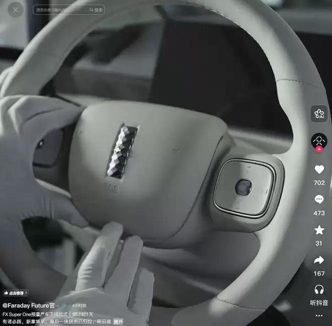 视频中的闪回画面展示了FX Super One的设计细节:新车轮毂采用纯白设计,中心镶嵌着FX车标;方向盘上也带有车标,但与轮毂不同的是,方向盘上的车标是印在一块亮面装饰条上,并非直接印在方向盘本体。