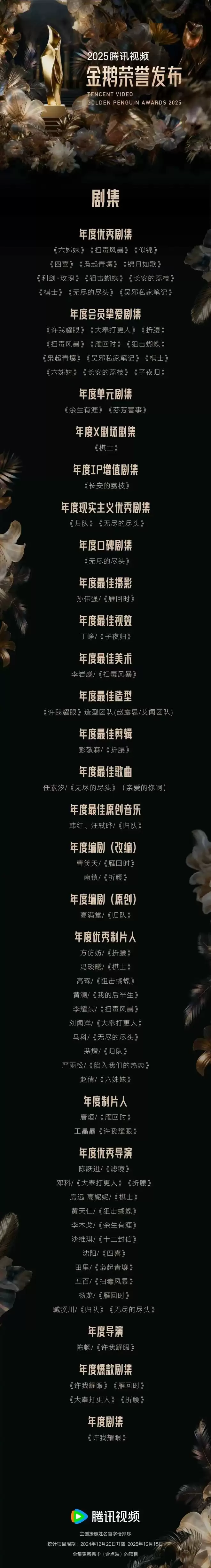 细看本届获奖名单,许多获得单项大奖的剧集同时也收获了创作部门嘉奖,正是专业度、精品度的体现。如《雁回时》的“年度最佳摄影”、《许我耀眼》的“年度最佳造型”、《折腰》的“年度最佳剪辑”,《归队》的“年度编剧(原创)”与“年度最佳原创音乐”。今年口碑最佳的《无尽的尽头》更一举将六项荣誉收入囊中,堪称六边形战士。