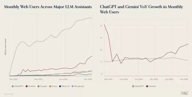 OpenAI虽然仍以8-9亿的周活用户占据领先地位,但其“超级应用”策略正面临挑战。而谷歌则以“试验田”模式推动Gemini迅猛追赶,其桌面用户同比增长高达155%,付费订阅增速更是接近ChatGPT的两倍。