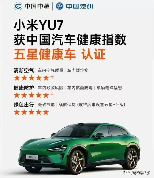 近日,新能源汽车领域传来一则备受瞩目的消息:小米YU7成功摘得中国中检与中国汽研联合颁发的“五星健康车”认证。这款车型不仅在车内空气质量、健康防护两大核心维度上双双斩获五星+的卓越评价,更在绿色出行层面同样赢得五星认可,为新能源汽车行业树立了全新的健康标杆。