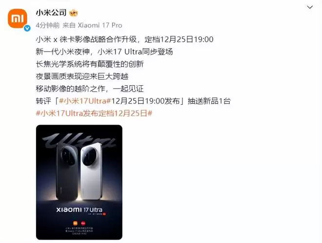 12月22日,小米手机官方微博宣布,与徕卡的影像战略合作将迎来升级,并定于12月25日晚上7点正式发布。届时,新一代“小米夜神”影像系统将首次亮相,小米17 Ultra也将同步登场。