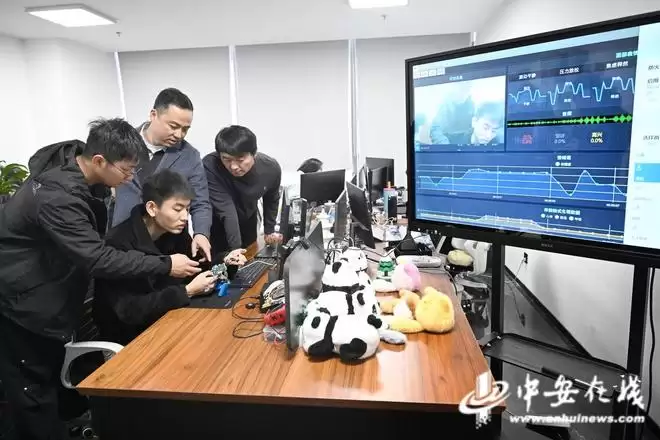 12月20日,安徽进化论科技有限公司具身情感智能平台研发团队正在实验室里交流。