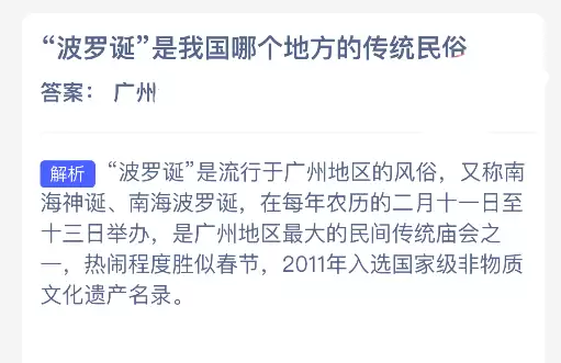 “波罗诞”是我国哪个地区的传统民俗?蚂蚁新村每日一题于2025年12月21日发布了这道题目。坚持参与答题,积累木兰币,就能加速您的小镇建设。答对本题,即可立即获得“生产速度+3/小时”的加速奖励!今日正确答案是广州。“波罗诞”是流行于广州地区的传统风俗,也被称为南海神诞或南海波罗诞。