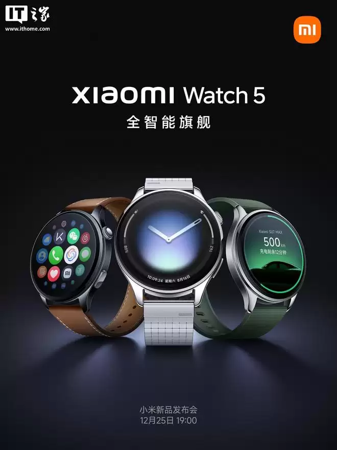 据IT之家12月22日报道,小米手表5今日正式官宣,这款全智能旗舰手表定于12月25日晚间发布。
