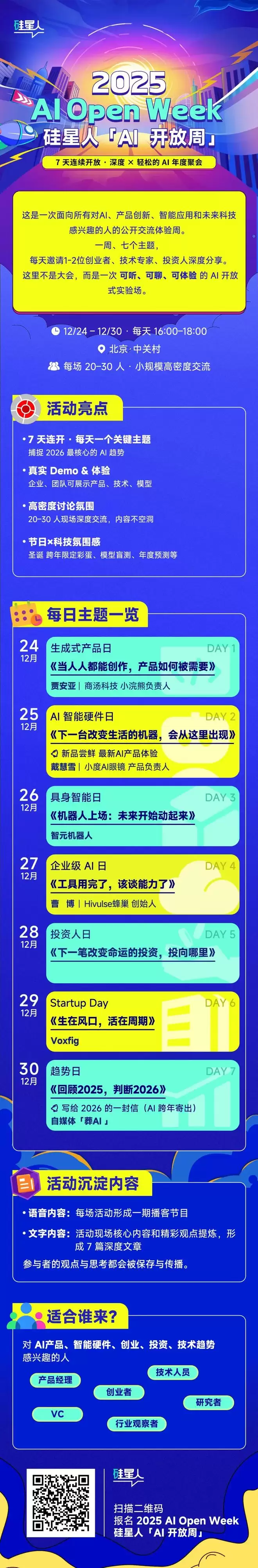 在加速变化的 AI 世界里,每一次面对面的交流,都可能成为新的起点。12月24日-30日,为期7天,硅星人每天都将邀请一到两位 AI 世界里正在做“很酷的事情”的朋友,来聊聊他们的新发现、新技术、新