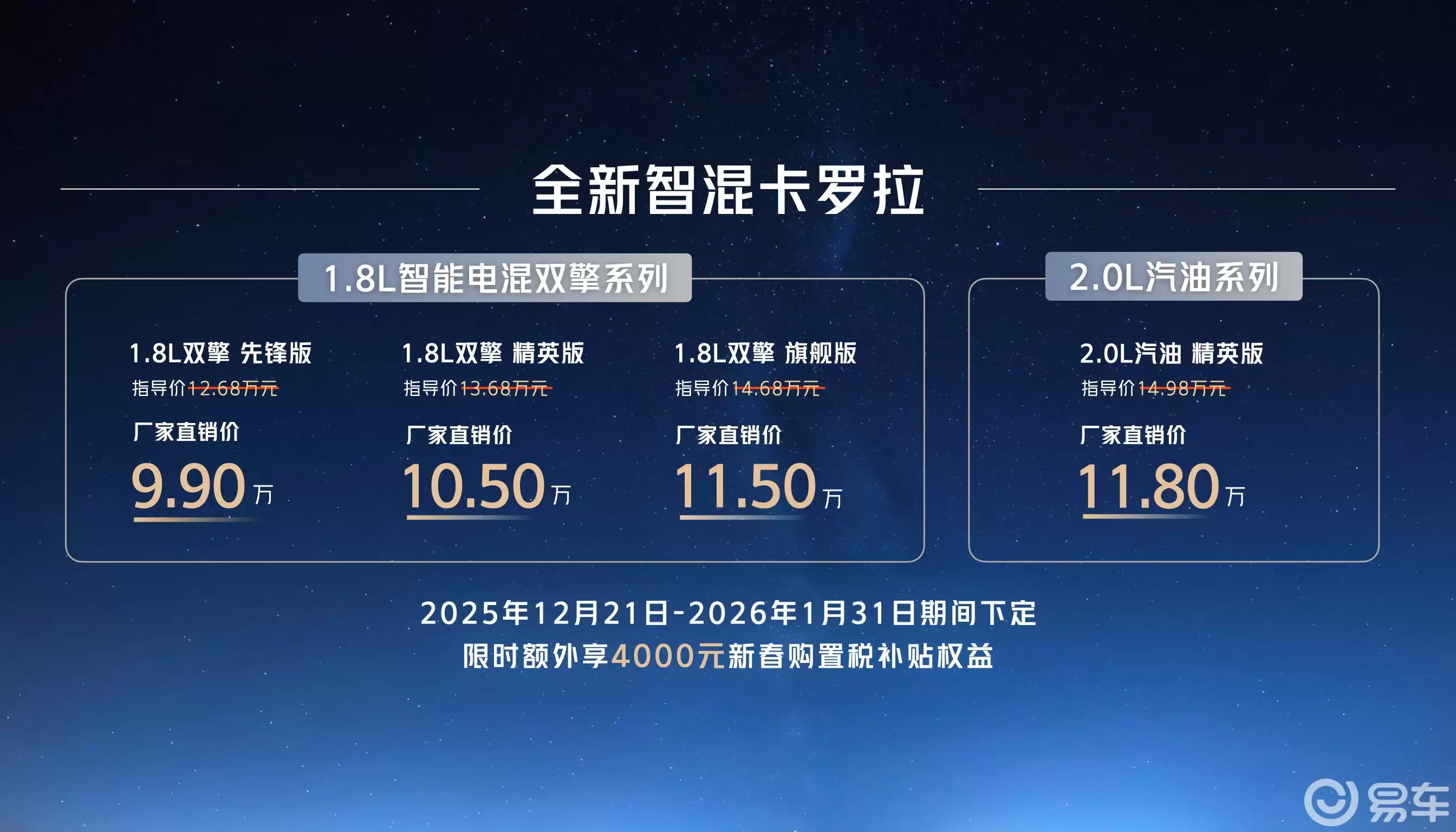 定位于“全球好品质+中国新家轿”的全新智混卡罗拉现已正式上市,共推出4款配置,官方指导价区间为9.9万元至11.8万元。即日起至明年1月31日,消费者下单即可享受4000元新春购置税补贴,进一步降低了购车门槛。这款车集空间、能耗、智能和安全优势于一身,凭借均衡的实力重新定义了家用轿车的价值标杆,自11月品牌之夜亮相以来,便持续吸引着市场的广泛关注。