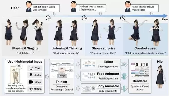 为了迎接这一行业共同的挑战,盛大 AI 东京研究院正式推出了Mio(Multimodal Interactive Omni-Avatar)—— 一个旨在实现「交互智能」(Interactive Intelligence)的端到端系统性框架。Mio 的诞生标志着一个分水岭时刻,其设计理念是将数字人从一个被动执行指令的 “木偶”,转变为一个能够自主思考、感知并与世界互动的智能伙伴。