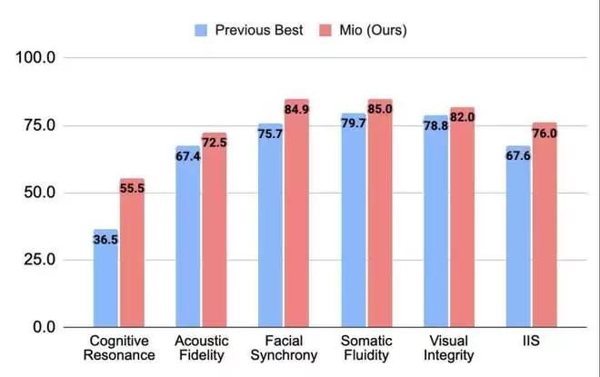 图 6 Mio (红色) 在认知共鸣、面部同步、肢体流畅度等各项指标上全面超越现有最优技术 (蓝色),IIS 总分达到 76.0。