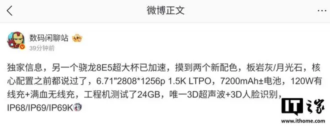 据博主透露,这款手机将搭载一块6.71英寸1.5K LTPO显示屏,分辨率为2808×1256,并配备7200mAh大容量电池,支持120W有线快充与满血无线充电。工程机已测试24GB内存,且它将是唯一同时具备3D超声波指纹与3D人脸识别功能的机型,还支持IP68/IP69/IP69K级别防尘防水。