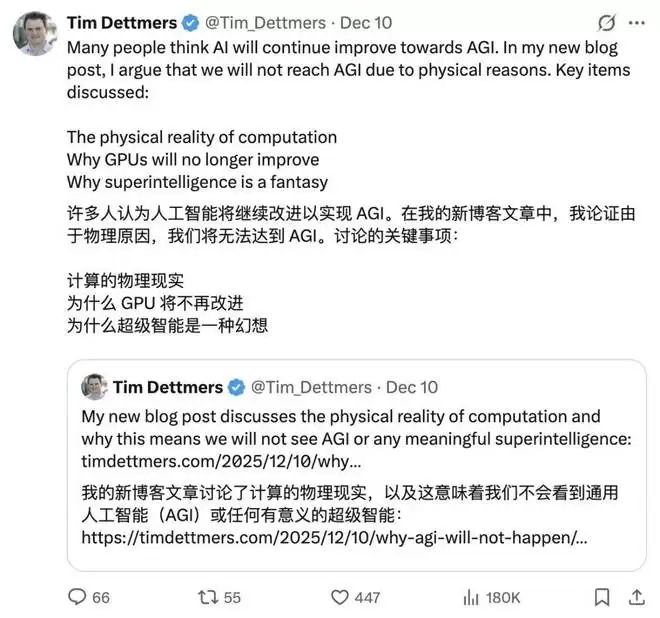 博客链接:https://timdettmers.com/2025/12/10/why-agi-will-not-happen/